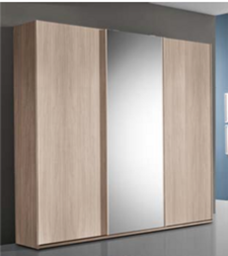 Armadio 3 ante scorrevole con 3 ante scorrevoli , la centrale a specchio, oppure 3 ante scorrevoli senza specchio, dotazione interna , 1 ripiano per vano e sei tubi appendi abiti. Possibilità di richiedere la cassettiera interna a 2 cassetti o 4 cassetti. Misura armadio, colori disponibili : olmo oppure bianco frassinato