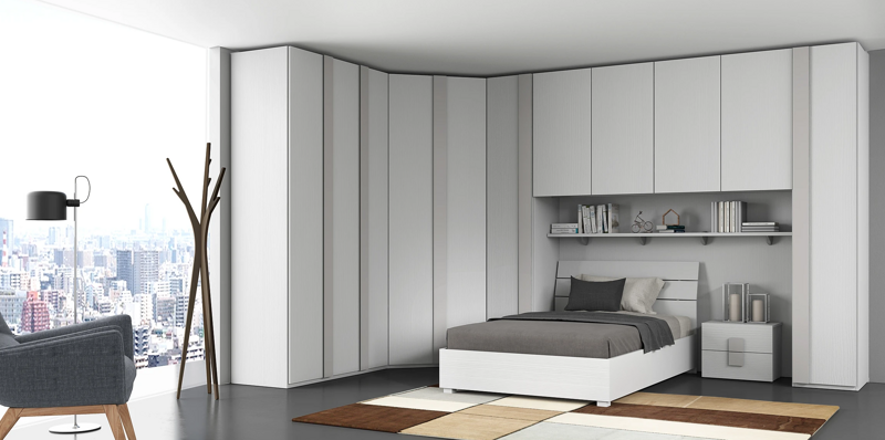 camera ad angolo composta : armadiatura con ponte L. 403x L.240 altezza armadio 241 x P.. 54 cm.. mesola sottoponte da cm 200x P.25 h. 2,5 comodino a 2 cassetti L.52 xP. 37 x H. 42 Letto Pro misura L. 129x P. 196 x H. 87. colori disponibili: bianco larice , olmo, tortora solo frontali