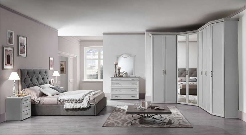 Composizione clarissa 1 cosi composta : armadio angolare H. 250 CM L. 218,2X302,9 , Comò a 4 cassetti H.89,8 XL.118,8 XP.48,3 , n. 2 comodini a 3 cassetti H. 54,7 x L. 48,6 x P. 39 Letto Clarissa H. 122x L. 182 x P. 209 cm. , Specchiera Marta H.94 x L.84 x P. 6,5 cm. Colori disponibili struttura e frontali : patinato beige, bianco frassinato , noce , interno in prisco.. maniglie in argento anticato per bianco frassinato e patinato , maniglia bronzo per tinta noce.