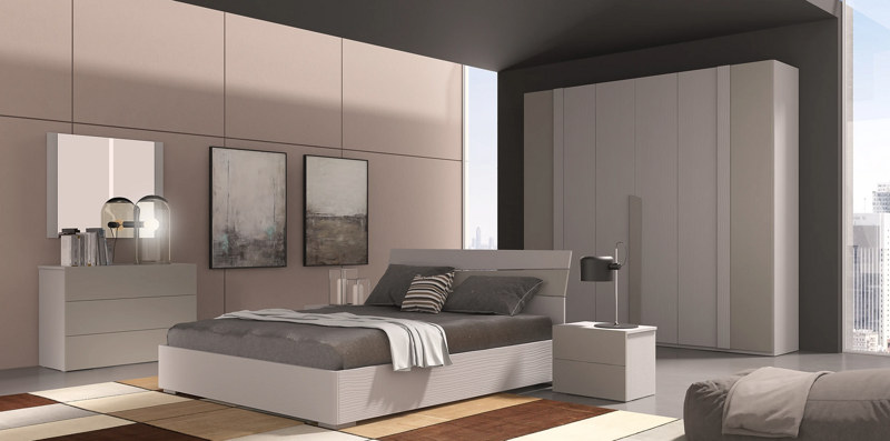 Camera matrimoniale cosi composta : Armadio 6 ante Battente misura : L.2520 x P.540 x H. 2410 mm., 2 Comodini Gar. L.520x P. 370 x H. 420 mm., 1 Comò Gar. L. 1060 X P. 460 X H. 750 mm., Specchiera da 960x800mm., letto Bormio L. 1690 XP. 1960 X H. 870 mm., colore struttura e frontali in larice bianco, olmo, solo frontale tortora. interno armadio beige tessuto stampato. Possibilità di avere il letto contenitore con una piccola maggiorazione .