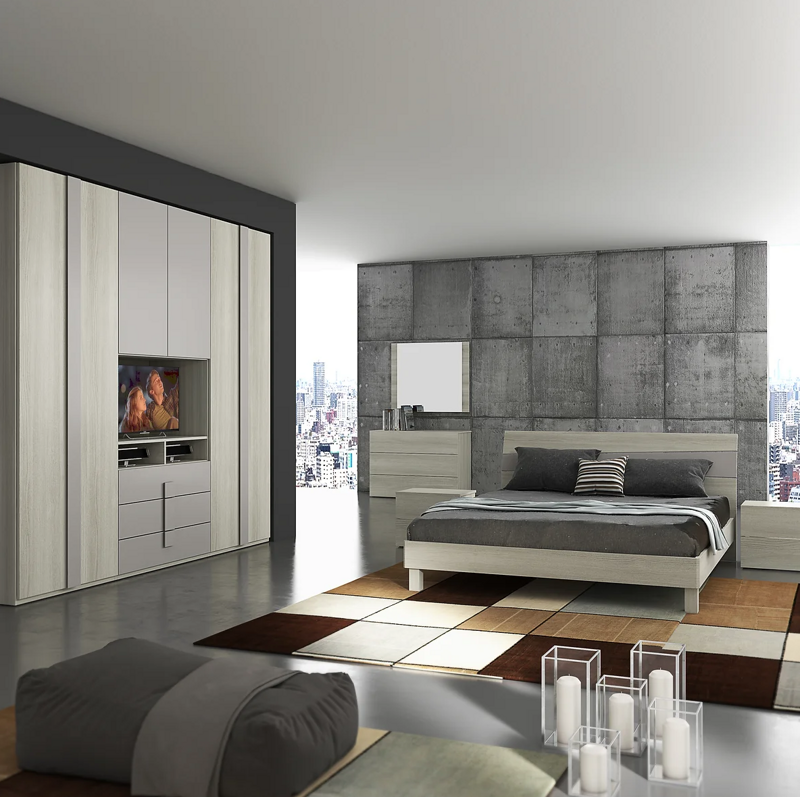 Camera 87B con armadio 6 ante battenti c/ porta TV L. 2730 xH. 2410 x P. 540 , 2 Comodini Gar L.520x P. 370 x H. 420 mm, Comò Gar L. 1060 xP. 460 x H. 750 mm. , Specchiera L.960x P.21x H. 800 mm.- Letto L.1690 xP. 1960 x H. 870. colori disponibili struttura e frontali , Larice bianco, olmo, tortora. maniglie colore larice bianco, olmo tortora , interno armadio tessuto beige stampato.
