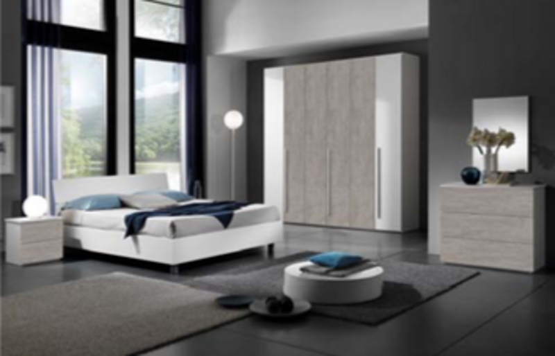 Camera matrimoniale cosi composta: colori bianco frassinato e cemento grigio, struttura bianco frassinato. 1 letto matrimoniale per materasso da cm 160x190 cm 1 comò , 2 comodini a 2 cassetti, una specchiera , Armadio 6 ante battenti con maniglia lunga , composta con 2 ante laterali bianco frassinato , 4 centrali in colore cemento.1 rete ortopedica da cm 160x190 , ingombro letto 170x200 cm .