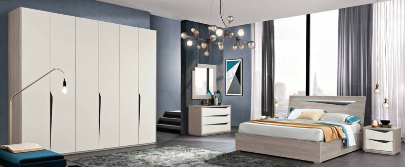 Armadio 6 ante battenti da cm.L.270,08xH.245xP.60,8, Comò 3 cassetti L.119.1xH.76,2xP.46.5, 2 comodini L.53,7xH.47,4xP.45 , Letto contenitore L.170xH.106xP.207 compreso rete ortopedica a doghe di faggio, Specchiera L.95xH.95xP3 . Cartella colori struutra bianco,grigio r, olmo , interno stampato, Finiture frontali: Bianco,Grigio,Olmo ,Cenere.
