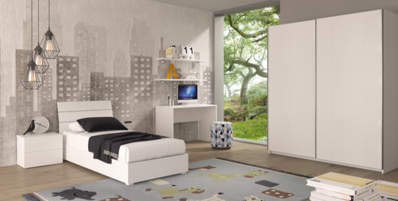Cameretta per sigle in colore Larice Bianco, composta: Armadio scorrevole 2 ante larghezza 182 x profondità 60 x altezza 210 cm. 1 scrivania da 110 cm , 1 comodino 2 cassetti G., 1 Letto contenitore da 80 , 2 mensole sopra scrivania, 1 rete ortopedica, 1 materasso da cm 80x190.