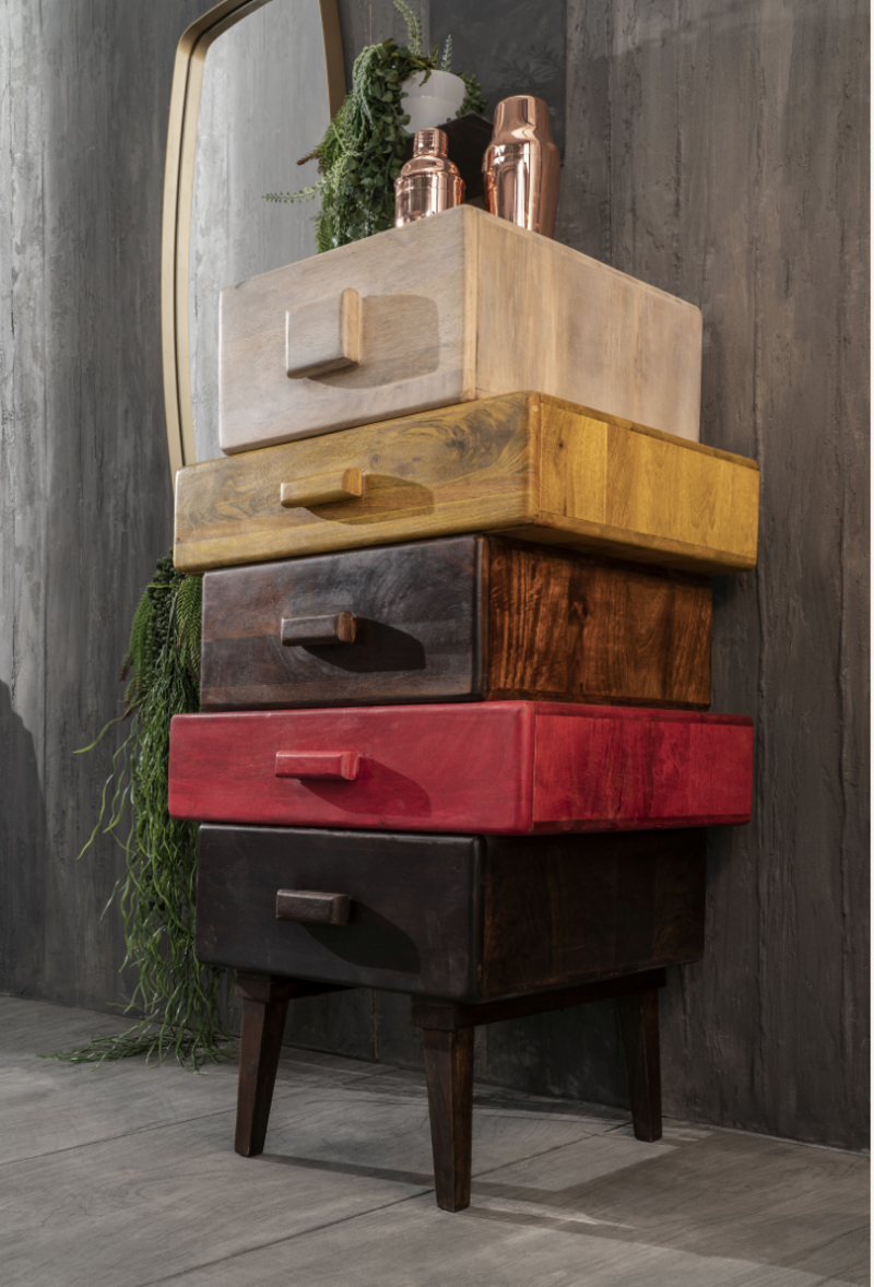 La cassettiera HANG è realizzata in legno di mango massello. Ogni cassetto presenta una differente colorazione che rende il prodotto vivace e unico.