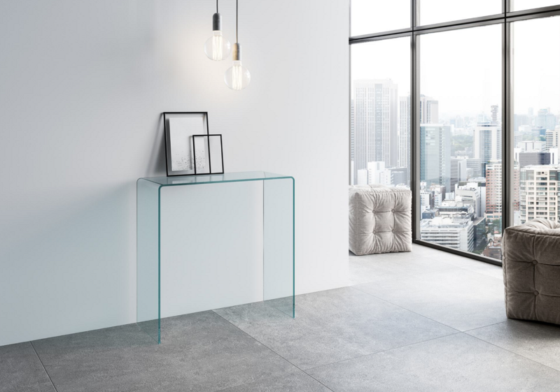Consolle Smak in vetro curvato da spessore 12 mm. Uno stile lineare ed essenziale conferisce grande eleganza a questa consolle, che grazie anche alle sue dimensioni contenute si inserisce perfettamente in qualsiasi spazio, creando poco ingombro e abbinandosi idealmente con gli stili più moderni. Ottima per essere utilizzata a parete in un ingresso, corridoio o soggiorno come mobile dove appoggiare gli oggetti, svuotatasche o porta vaso. Ideale anche per uno studio o un ufficio. Il design elaborato del vetro curvo saprà arricchire i vostri spazi con la sua dolcezza e leggerezza.