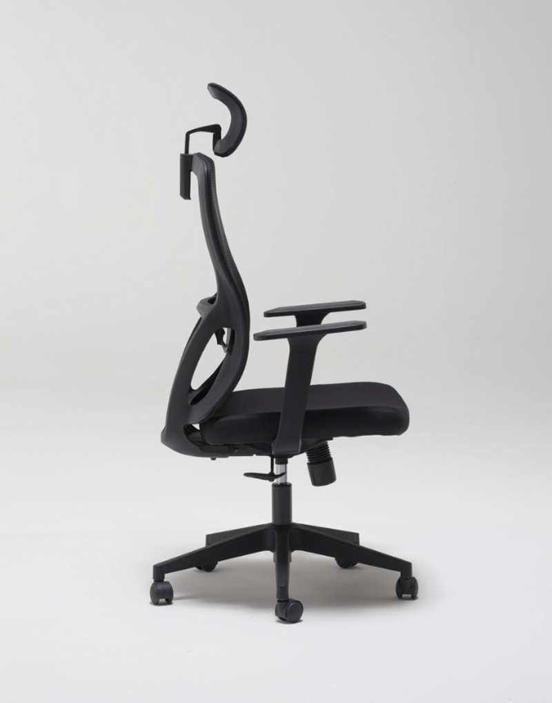 Ruote rigide libere d.50, base nylon piramidale d.640, meccanismo synchro monoblock con tensionatore, sedile in multistrato di legno con imbottitura in poliuretano espanso e rivestito in tessuto nero , schienale in nylon rivestito in rete nera, poggiatesta regolabile in altezza rivestito in rete nera , braccioli fissi in polipropilene, fornita smontata , meccanismo , braccioli, schienale e poggiatesta da assemblare.