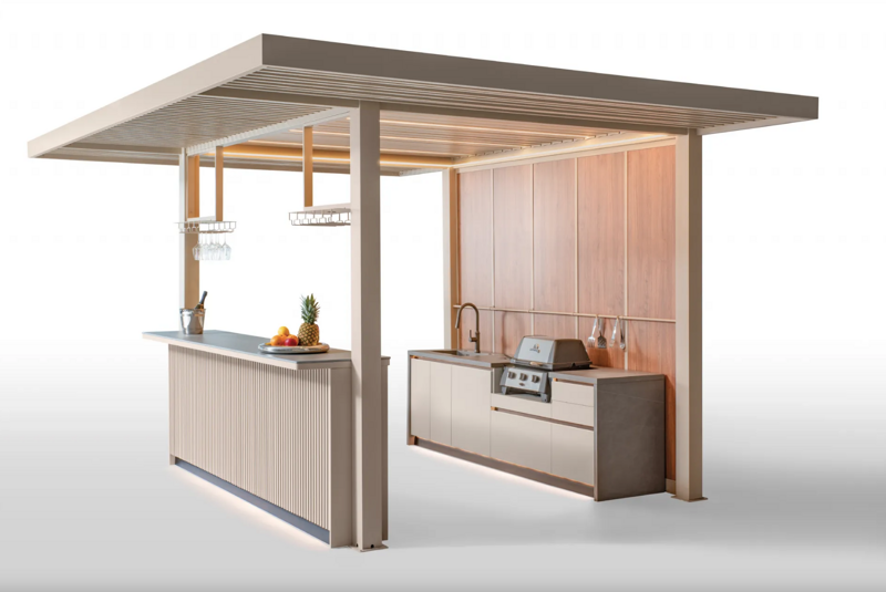 Il Pavi Bar è la scelta ideale per i tuoi eventi all’esterno anche al mutare delle condizioni atmosferiche. La struttura è pensata e realizzata per ampliare lo spazio di lavoro esterno, è in alluminio verniciato a polveri poliesteri, è amovibile ed è dotata di tetto bioclimatico, bancone e lavello. Grill non incluso.