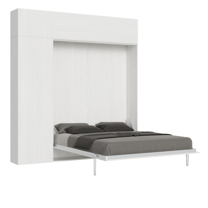 Letto matrimoniale Ken Bianco Frassino con colonna – pensile vasistas – pensile sopra colonnaComposizione con letto matrimoniale a scomparsa Ken, con colonna e due pensili della linea , una soluzione di design ed originale per una zona notte estremamente funzionale e smart. La colonna può essere riposta sia a destra che a sinistra rispetto al letto. I pratici e spaziosi pensili e colonna, consentono di riporre al proprio interno tutto il necessario per una camera sempre in ordine. Perfetta per un monolocale o un bilocale in cui ogni centimetro fa la differenza, questa composizione salvaspazio per zona notte consente di sfruttare pienamente tutto lo spazio a propria disposizione. Un letto a scomparsa estremamente pratico che quando aperto non presenta differenze da un normale letto matrimoniale, garantendo comodità e comfort. Quando chiuso occupa solamente 39 cm di profondità, permettendo di usufuire interamente degli spazi a disposizione, permettendo di fronteggiare in questo modo ogni tipo di esigenza. La discesa del letto è agevolata da pistoni a gas. Dotato di pratica maniglia per assistere la discesa. Il materasso che può essere usato non deve superare i 24 cm di spessore. Rete a doghe compresa. Materasso non compreso. Colonna con 3 ripiani interni, di cui uno strutturale e due posizionabili in base alle necessità. In fase di montaggio l’apertura dell’anta può essere posizionata a destra o a sinistra a piacimento. Meccanismo di apertura soft touch tramite push-pull assistito da pistoncini a gas: sarà sufficiente una lieve pressione del pannello per consentire l’apertura del mobile colonna. Pensili con apertura tramite meccanismo push-pull soft touch assistito da pistoncini a gas. Struttura della rete in ferro rinforzato verniciato a polvere epossidica colore alluminio goffrato dimensioni consigliate del materasso: cm.160×190 H.24 struttura del mobile 18 mm composta da particelle di legno nobilitato. Altezza da terra della rete aperto: 22 cm rete a doghe di faggio cm.163×190 cinghie ferma materasso movimento assistito da pistoni a gas portata massima letto kg 250.
