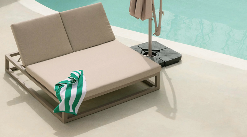 Lettino Doppio Reclinabile in Alluminio con Cuscino in Tessuto Kew , ideale per la tua terrazza, giardino o piscina. Il lettino è per due persone, il che lo rende un pezzo originale, potrai prendere il sole o riposarti con chi vuoi. La