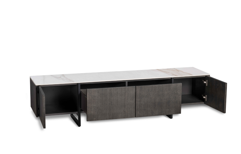 Porta TV in MDF impiallacciato con finutura ebano . Due ante con chiusura ammortizzata. Top in ceramica marmo nero Portoro. MISURA: L.P.H. 1800X400X450