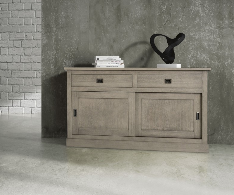 Credenze ante scorrevoli in legno colore rovere patinato con 2 ante scorrevoli, 2 cassetti e 2 ripiani che percorrono tutta la lunghezza, montata