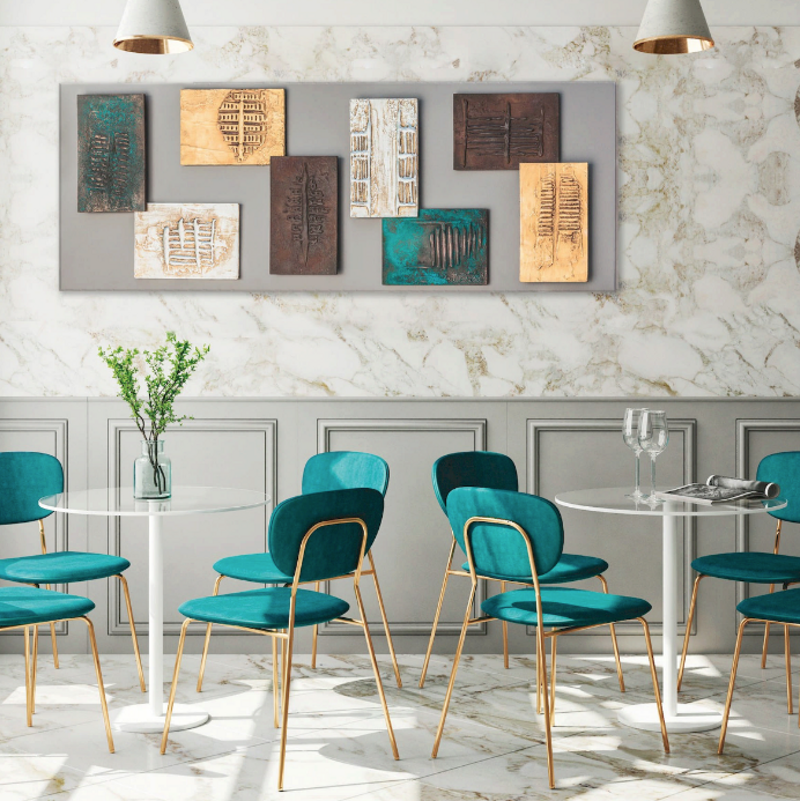 • Decorazioni artigianali: otto elementi sovrapposti, lavorati a mano con finiture oro, argento, nantokite e ruggine, creano un gioco di texture e luminosità unico.