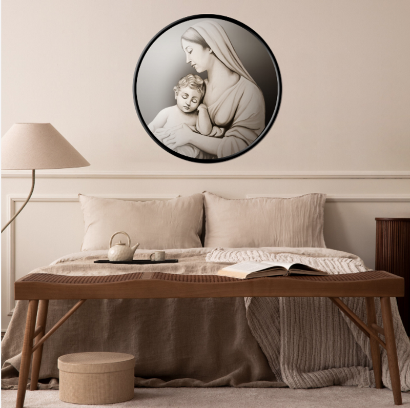 • Design versatile e moderno: il formato tondo e la cornice opaca rendono questo quadro adatto a interni moderni e minimalisti, ma anche a spazi dal gusto classico che vogliono un tocco contemporaneo.