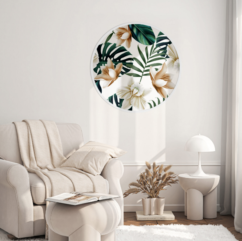 Cornice in metallo laccata opaca, disponibile con finitura opaca, la cornice di 3 cm. di spessore conferisce un tocco moderno senza appesantire l'opera , incorniciando le orchidee in modo sobrio e sofisticato.Diametri disponibili: diametro 100 cm, diametro 80 cm. diametro 60 cm. Facile da appendere : ogni pannello include un gancio preinstallato , per facilitare l'installazione e garantire stabilità.Prodotto ecosostenibile Made in Italy.