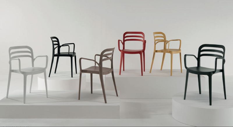Sedia con bracciolo impilabile in polipropilene. Disponibile in diversi colori.