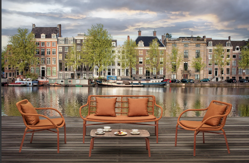 Il divano Lea costruito su un solido telaio in alluminio rivestito da una corda sintetica intrecciata a mano. La cuscineria è in tessuto 100% poliestere, sfoderabile.