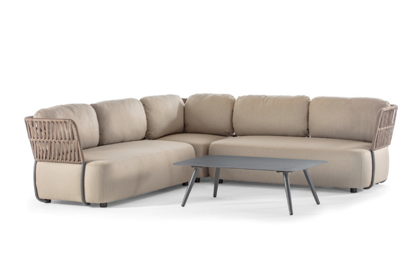 COORDINATO CON STRUTTURA IN ALLUMINIO E RIVESTIMENTO IN CORDA POLYOLEFIN, COMPOSTO DA DUE DIVANI A DUE POSTI, UN ELEMENTO ANGOLARE ED UN TAVOLINO CON PIANO IN ALLUMINIO.CUSCINERIA IN TESSUTO ACRILICO E GOMMA RESISTENTE ALL’ACQUA.