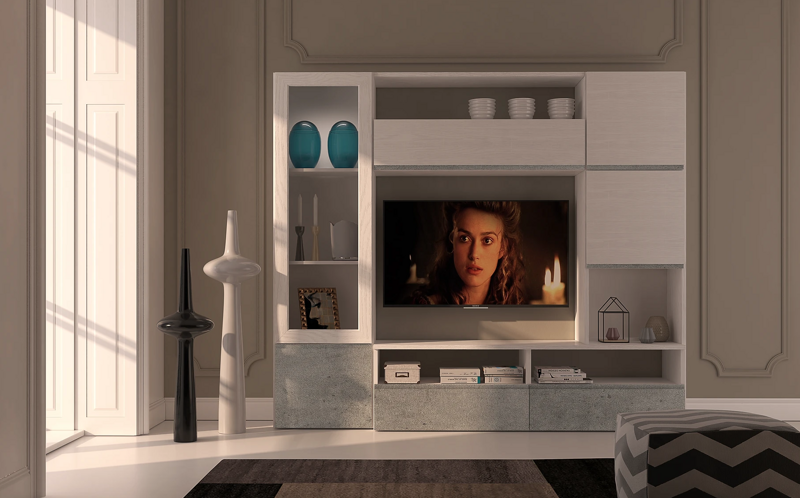 I cassetti già assemblati con guide ammortizzate assicurano una chiusura dolce e sicura, rendendo l’utilizzo quotidiano un vero piacere. Al centro, uno spazio ampio è pensato appositamente per il televisore, trasformando questo soggiorno in un perfetto punto focale della zona living, elegante vetrina con telaio in frassino gesso accessoriata con faretto led optionale a sensore.