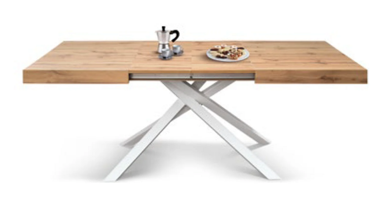 Tavolo allungabile misura 140x90 cm. con 2 allunghe da cm 40 , misura con 1 allunga 180x90 aperto con 2 allunghe 220x90 cm. struttura in metallo bianco verniciato, piano in rovere rustico, allunghe stessa finitura. prezzo da stock fino a fine scorte , pronta consegna (tempo di imballaggio e spedizione circa 10 gg. Ritiro presso sede 3 giorni lavorativi.
