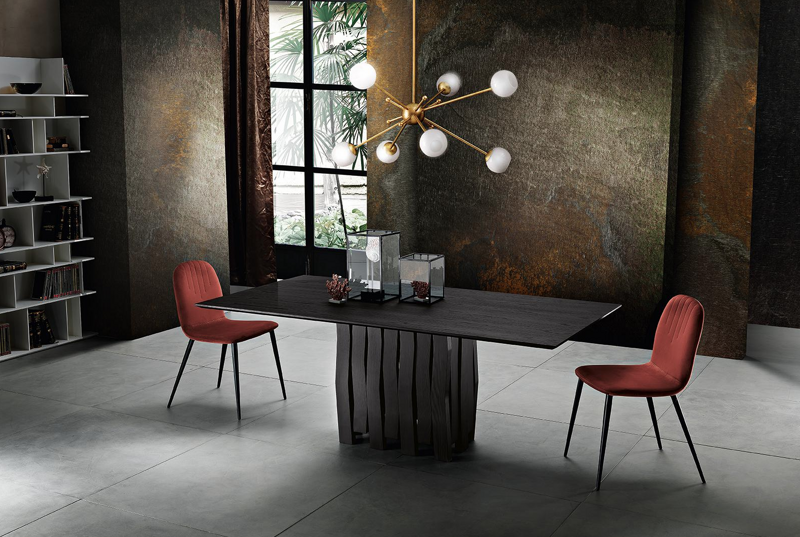 Esprime il coraggio di osare andando fuori dagli schemi, con il suo originale basamento costituito da molteplici gambe in legno di diverso spessore e lunghezza che vanno a creare un corpo unico in grado di esprimere forza e carattere.