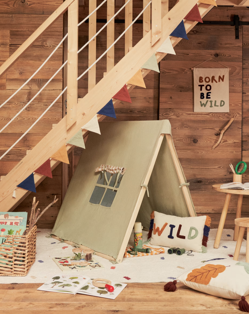 La tenda Indiana Anil, realizzato in cotone, crea uno spazio diverso per far volare la tua immaginazione, sotto forma di nascondiglio, di scenario per una storia di avventura nella foresta o un luogo dove leggere e giocare.