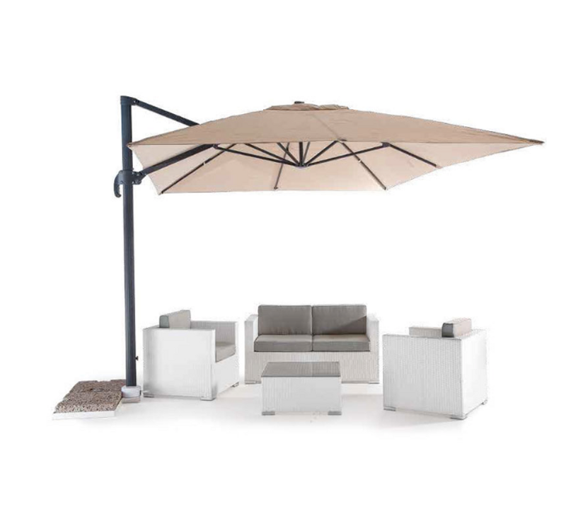 OMBRELLONE RETRATTILE CON STRUTTURA IN ALLUMINIO VERNICIATO ANTRACITE O BIANCO, STECCHE IN ALLUMINIO E COPERTURA IN TESSUTO OLEFIN CON VERNICIATURA IDROREPELLENTE.APERTURA A SBALZO.SISTEMA DI ROTAZIONE A 360°. ZAVORRA ESCLUSA.