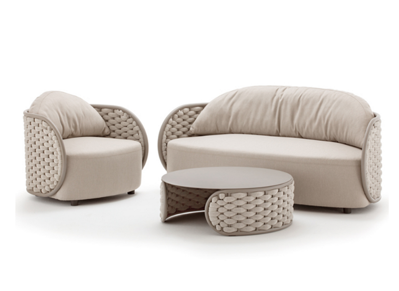 COORDINATO CON STRUTTURA IN ALLUMINIO E RIVESTIMENTO IN CORDA POLIESTERE E GOMMA, COMPOSTO DA DUE POLTRONE, UN DIVANO E UN TAVOLO CON PIANO IN ALLUMINIO E CUSCINERIA SFODERABILE.
